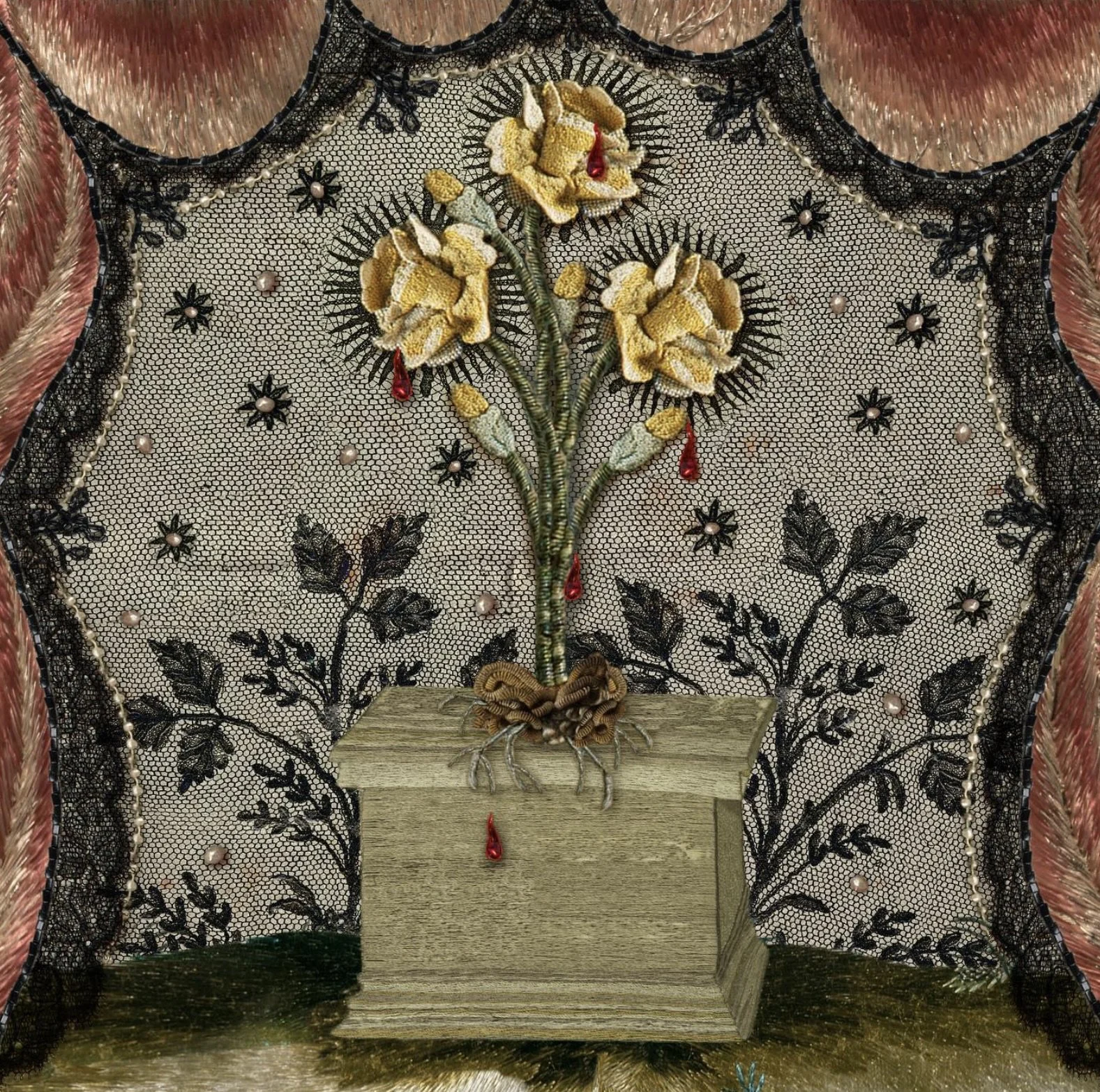 A flower is a particularly special Memento Mori, as it is not confined to a symbol within the background of a painting or the pages of a book. Flowers are Memento Mori we interact with regularly, we invite in our homes and hold bunched in our arms. As a florist, I am privy to a constant discourse around the ‘worth’ of flowers as living and dying objects. Some say flowers are not worth investing in, because all they do is die. Others say that this is precisely the reason to invest in them. I believe that mortality should not be feared. Flowers, like all Memento Mori, are mirrors. They reflect what all humans share: a life cycle. The inevitability of their death is no different to the inevitability of our own. Thus, the beauty of their life reminds us to appreciate the beauty of our own. There is perhaps no better representation of the flower as a Memento Mori, than in the artworks of Andrea Zanatelli. Zanatelli is an Italian artist deeply inspired by stories and visuals from ‘Bygone eras’ such as the Pre-Raphaelite and Arts and Crafts movements. His work typically features one central symbol: a heart, a lung, a disembodied hand, an eye, a flower stem, a spiderweb, or a portrait; adorned with highly decorative collages of antique fabrics and intricate bejewelled embroideries. His maximalist approach to artmaking gives his works a sense of sublime, overwhelming beauty- a beauty that exists synonymously with the darker themes he so often references. ‘The Sacrifice and the Resurrection’ from Zanatelli’s embroidery series, features a Daffodil sprout with its roots still attached, bleeding with sparkling drops of crimson blood. Though the flowers are emerging upwards for their Spring ‘resurrection’, the blood which drips from their buds reminds them of their fragile life which they will come to sacrifice once more as their season ends.