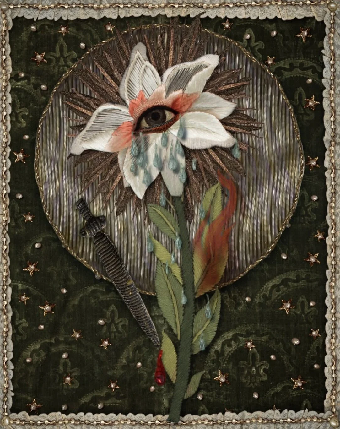 The sunflower embodies a hopefulness in the momentary brightness of the day, as opposed to a dread associated with the coming night. In both works, the sunflowers have eyes, drawing parallels to us as an audience. Alike the sunflowers, we rise with the light and descend with the darkness. In ‘The Rising Suns’, tears can be seen descending from the eyes, rinsed away in the anticipation of a new day. Zanatelli’s works also highlight flowers as connecting forces to higher realms. As death symbols, his flowers act much like Anabella’s heart in ‘Tis Pity- a liminal force connecting the audience to something transcendent. He attributes his flowers to Saints, such as in ‘May it Watch Over You’ and ‘St Lucy’. Again, the motif of the eyes gives the flowers a human quality, a tether from us to a realm of magic. One of his works from the embroidery series commemorates Joan of Arc, with burning leaves and a threaded sword. In this way, Memento Mori almost become a burial rite- an object to immortalise a life once lived.