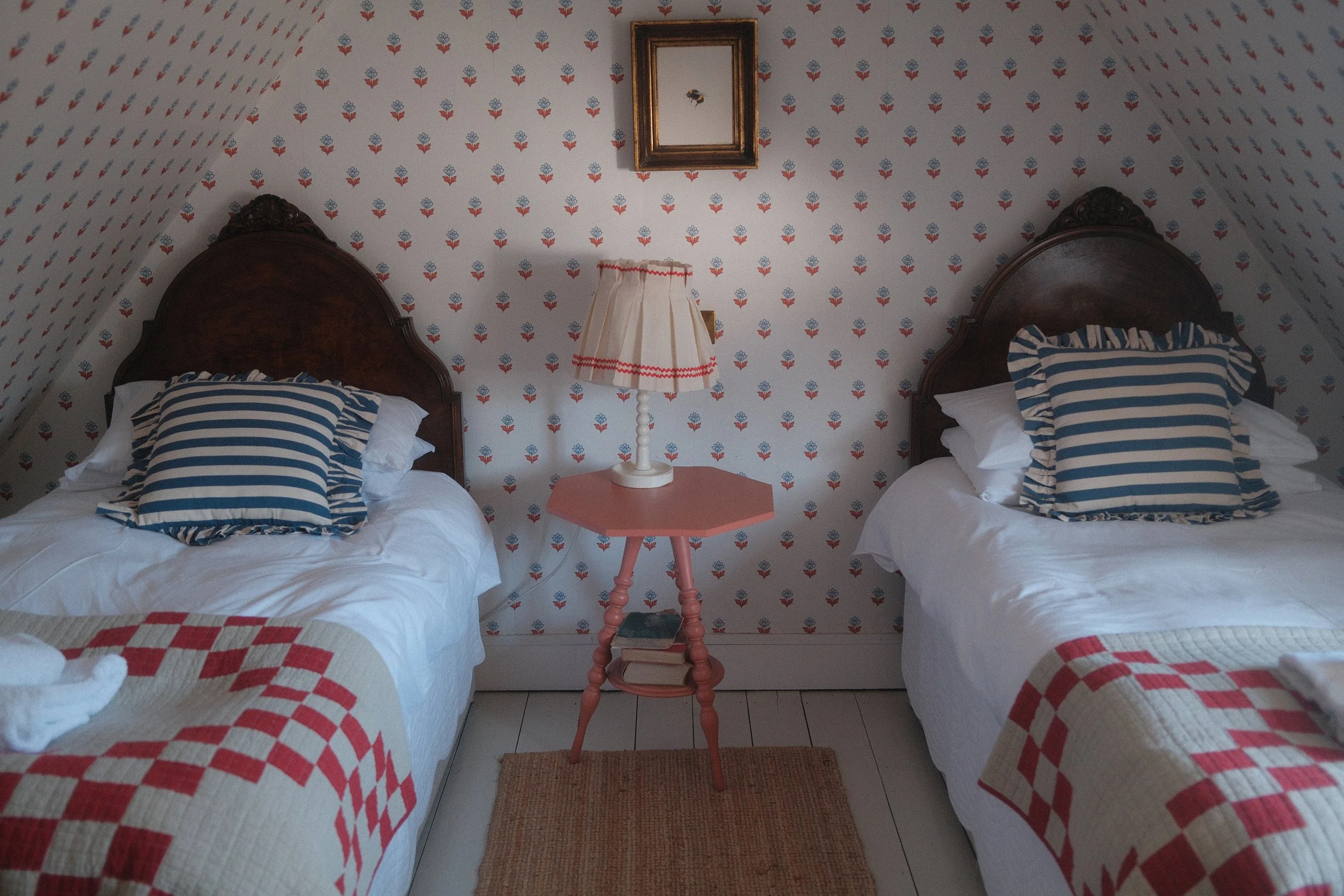 Up a narrow staircase, the first room revealed itself in deep, calming green. Thoughtfully decorated, with generous closets and a quilt-covered bed that felt like falling into a cloud. Just across the way, a bathroom in rich warm tones and a glowing copper bathtub at its center, inviting us to slow down and simply be. The terracotta floor tiles whispered of sun-drenched southern cities… but weren’t we in the south of England after all?