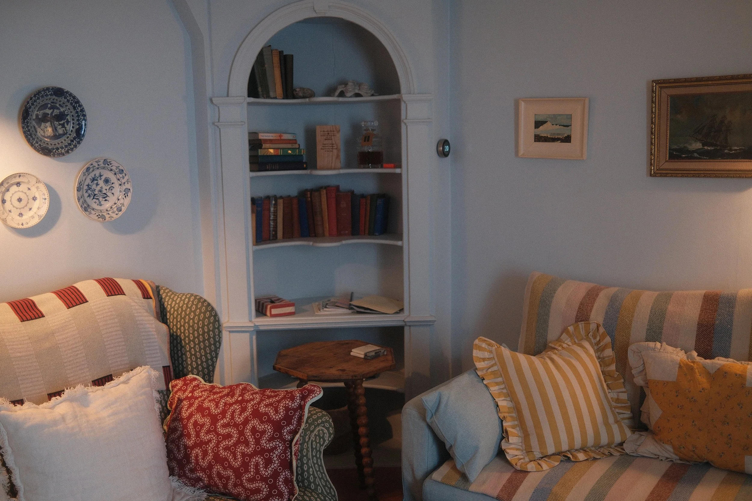 A soft light welcomed us into a cozy sitting room, where a fireplace rested in a brick alcove, as if waiting for us. A little built-in library caught our eye — and stole our book lovers hearts. We hadn’t even crossed the threshold, and already, it felt like home.